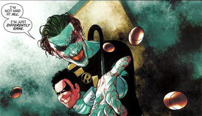 Hell, the Joker seems to confess that he’s not as much of a complete nutjob as one might expect. “You were right about me, Baby Boy Wonder,” he mocks a subdued Damian. “I’m not mad. Not even a teeny bit.” Damian points out that, were the Joker’s belief that everything is a joke actually true, then even the character’s skill and intelligence are just a punchline to be mocked. There’s very clearly method to the madness of the “differently sane” psychopathic monster clown.