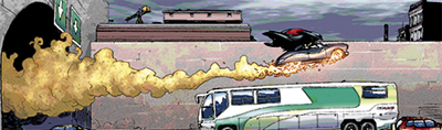 Grant Morrison’s sixteen-issue run on Batman & Robin perhaps offers an attempt to reclaim that period – an attempt to suggest that the colours can be bright and the stories goofy, while still being clever and complex. It is as if Adam West’s Gotham was crossed with Salvador Dali or Andy Warhol. Morrison’s long-term collaborator Frank Quitely provides the artwork for the first arc and the covers for the full run, and it’s his style which undeniably sets the tone for those that follow. There are numerous little touches which lend the series an almost retro appeal – be it Quitely’s revised flying Batmobile or the decision to draw sound effects (like the one above) or even the recurring motif of a corny “double punch” into the comic.