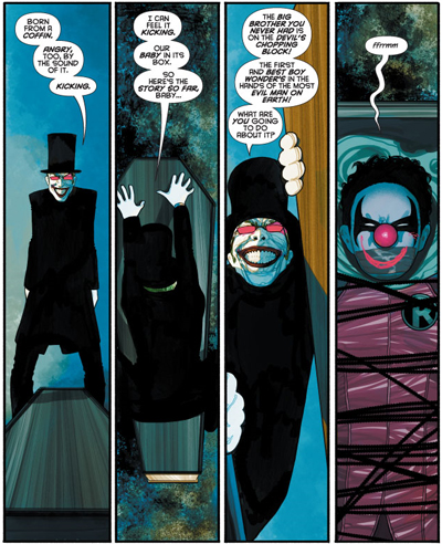 Still, it’s interesting how Morrison subtly alludes to Dick’s background in crafting an entirely new selection of bad guys for him. Indeed, Morrison’s first new set of adversaries for the character are “The Circus of Strange” (Dick is literally able to speak their language – “European circus slang”). Even Professor Pyg began his life as “a species of circus performer.” Morrison goes out of his way to create colourful new villains for Dick (as opposed to the darker and grittier ones he crafted for Bruce), designed to play to Dick’s more colourful nature. Even when the long-established Batman villain The Penguin appears briefly, he resembles the grotesque sideshow freak from Burton’s Batman Returns rather than the stocky businessman of comic book continuity. The only really established outside villain who appears (aside from Talia and the Joker) is Deathstroke, who has his own history with Dick and makes for an interesting foil.