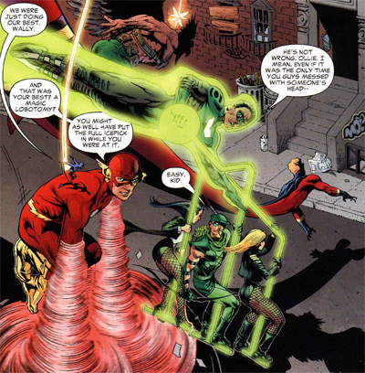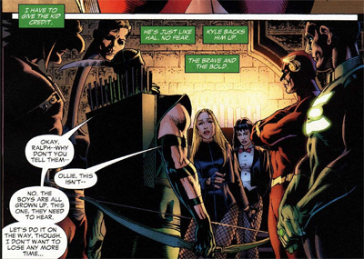 I do like the way that Meltzer contrasts such random and haphazard jolts in characterisation with the more logical progression offered by legacy characters. While the author is trying to explain why Batman is not the same character that he was thirty years ago, or who Dr. Light suddenly became “a moron”, he has a perfectly solid justification for why the Flash and Green Lantern are different. Indeed, he shrewdly points out that each is more like the other’s predecessor. “Like Barry, Kyle offers a handful of rational kindness,” Ollie observes. He remarks of Wally, “He’s just like Hal. No fear.” It does make a solid argument for the use of legacy character to stage an internal evolution within the confines of a superhero universe, something that DC seems to have forgotten about of late.