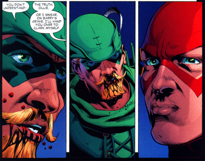 In fact, despite the story’s cynicism, you could read it as an inherent defense of the increasingly maligned and ignored secret identity. In recent years, the concept of the secret identity has been increasingly sidelined. Wolverine is Wolverine, inside or outside the costume, it’s the same stuff. Frank Castle is never not the Punisher. In Iron Man, Tony Stark declared, “I am Iron Man.” In Batman & Robin, Bruce announced his connection to Batman. The secret identity seems like a quaint little concept, a hangover from the Silver Age. Identity Crisis seems built around the idea of justifying this old trope. “There are animals out there, Wally,” Ollie explains. “And when it comes to family, we can’t always be there to defend them. But the mask will.”