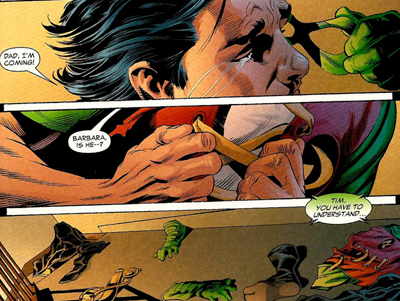 Indeed, I thought it might have been interesting to see a male companion of a female hero getting attacked and victimised – after all, it’s not just women that are physically weaker than super-villains. What about Steve Trevors? How come he couldn’t get roughed up? Who not Alfred, the ultimate civilian supporting character? Ollie spends much of the book worrying about Black Canary, but how come she never seems too bothered about him? Indeed, Lois seems more concerned about Clark’s concern about her than she does about his own safety. You could argue that the death of Jack Drake, Tim Drake’s father, is an attempt to rebut this, but it doesn’t really feel like it. After all, he’s clearly so macho that he at least kills his assailant.