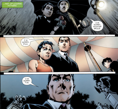 Batman is arguably no better. “Bruce gave me make-up to hide most of it,” Tim remarks of the bruising he received on routine patrol. It doesn’t even seem like an exceptional night. It’s an attempt by Bruce to placate Tim’s worried father, but also to conceal the reality of what his son is doing with that reclusive billionaire. The use of make-up to cover bruising is uncomfortably close to the standard signs of domestic abuse, and Batman’s attempts to hide Tim’s risks underscore just how morally compromised the whole idea of a sidekick actually is.