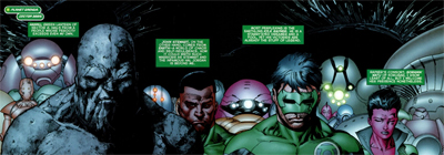 In the lead-in to War of the Green Lanterns, is contrast, we’ve ended up with any number of plot points shoe-horned into stories that are in progress. Guy Gardner’s convenient exposition-filled explanation to Kilowog and Arisia was a bit distracting, and it was an obvious attempt to synchronise the reveal, but it wasn’t nearly as bad as the stuff Bedard has to deal with. We open with some shady deal being made between the Guardian Ganthet, Guy Gardner and Atrocitus, which has more bearing on Green Lantern and Emerald Warriors than it does with Green Lantern Corps (since Guy and Atrocitus seem to be doing stuff about the deal, while Ganthet just goes along with whatever’s happening).