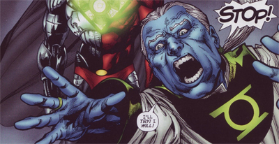 After providing the mandated back story, the Cyborg Superman attempts to justify taking an opportunity to tell John Stewart what he already knew. Apparently “new readers” is a bit too meta, so he comes up with the trite, “Because I want you to understand: I am not a monster. I’m the victim.” Ganthet is devastated by the loss of a Lantern, and asks, “What is this terrible… ache in my chest?” The Cyborg Superman, evidently having used his down-time to take a masters course in melodrama, replies, “It’s called grief. One of those wonderful emotions you little blue know-it-alls ignored for so long.”