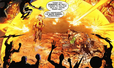 More awkwardly, Bedard does his “synchronised reveal” in the most ham-fisted way possible, when Ganthet starts vomiting blood in the middle of an unrelated rescue mission. We’re treated to several pages of Ganthet explaining everything, none of which matters to the event at hand. Even the bad guy, the Weaponer, seems mildly frustrated that his plotline has been interrupted for this moment. Ganthet might as well have introduced his revelations with the line, “and now for something completely different…” Still, the tie-in aspect of the story aside, how does Bedard do?