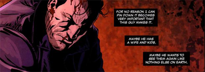 Punisher MAX isn’t as confined as Marvel Knights. There’s some discussion as to whether it shares continuity with Marvel Knights, or if superheroes exist here and all that nonsense. It doesn’t matter. Ennis hints at events that he has written about elsewhere – not just in Marvel Knights, but also in Hitman at DC. So he isn’t confined by standard comic book continuity. And, to be frank, I honestly don’t care whetehr a story is “in” or “out” of continuity. Good writing is good writing. Anyway, given this new book to work on, Ennis decided to radically redefine the character.