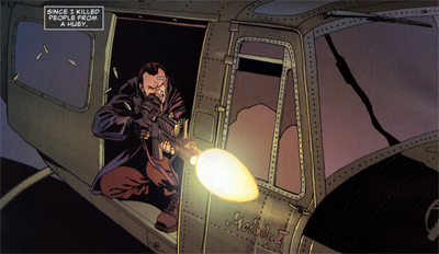 The most obvious change from standard comic books is that Frank Castle ages. He’s actually still a Vietnam Veteran, pushing sixty. He’s been active for quite a while, and has an impressive bodycount. It’s interesting that Ennis calls this arc In The Beginning, because it’s actually more about closure. We see Frank’s war with the mob enter what might be endgame, and Ennis brings back Microchip to resolve some outstanding issues that Frank has.