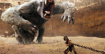 • Yes, the chain broke easily at one point, but then he was in the dungeon and the arena and the chain didn’t break. He could pull it from rock in arlier scenes, why not in those scenes? It’s not a problem, mind you, I actually thought it was affectionately pulpy. I think that sort of thing added to my enjoyment.