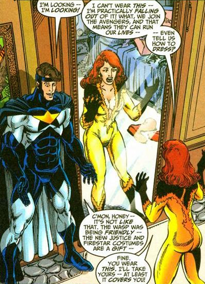 Busiek does seem just a little bit aware of Perez’s fascination with revealing costumes, and seems to draw a line through giving an especially skimpy outfit to the barely-legal Firestar. “I can’t wear this — I’m practically falling out of it!”she declares. Later on in the series, the colourist has added a bit more fabric to the costume. Still, Perez is a master of his craft, and there’s a reason he’s one of the most respected artists in comics. While Perez does sterling work and his issues look stunning, I couldn’t help notice that the transfer on the non-Perez issues looks a bit blurry, though.