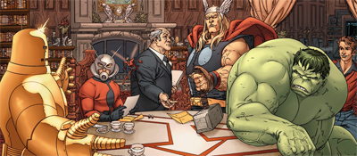 Instead, it’s bureaucracy. Bureacracy is boring when played as drama. It’s even more boring and far more silly when you involve men in tights in the whole affair. Iron Man welcomes his guests to the Mansion and, as the first order of business, advises them, “these envelopes contain both our charter and a proposed draft of our by-laws.” I hated when Kurt Busiek’s Avengers focused on the administration of the team, and it’s no different here. “I, for one, shall not succumb to the hypocrisy of midgard bureaucracy,” Thor remarks. I, for one, agree with him. Ant-Man, for example, suggests, “The sooner we can get past these administrative hassles, the sooner we get to work for real.”And yet we somehow spend the next seven issues fixated on them.