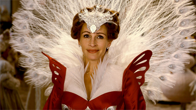 Singh seems more interested in the stylish and lavish production design than anything actually happening on screen. Indeed, it seems like his fictional world is a bunch of closely-connected sets rather than a magical kingdom. At one point, Snow White is able to run from the isolated home of the exiled dwarves to the town centre without breaking a sweat. Later on, the Queen is able to make it from the same clearing back to the castle and through her magic mirror over the course of the climactic confrontation. It seems like Julia Roberts literally wondered from one set to another.