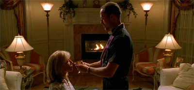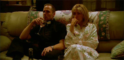 In particular, though, I do like the way that Chase plays with the sexual imagery at the heart of the chaste Catholic religion – the ritual of kneeling in submission, drinking and consuming from a chaste priest. Indeed, Tony even comments on it, in his own bullish way. “Oh, I bet he gave you communion,” he jibes after Father Phil stayed over. “Well, Carmela, the guy spends the night here with you and all he does is slip you a wafer?” Carmela warns him, “That’s verging on sacrilege.”