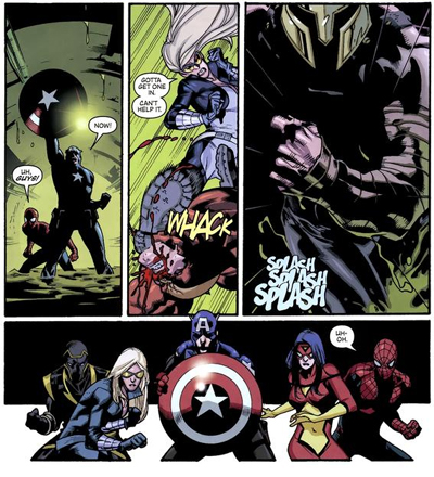 Indeed, Bendis casts Spider-Man as the voice of reason, as if to emphasise that he’s putting the whole Avengersteam in the position that made Spider-Man so popular all those years ago. Alarmed at Hawkeye’s plan to assassinate Osborn, a decidedly unheroic act, it’s Peter who gives the group their moral centre, pointing out that the situation is new and that the team is in an uncomfortable position, but one that’s second nature to him at this stage.