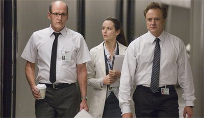 There is something inherently voyeuristic and uncomfortable about those sorts of films – with the audience watching and salivating at the potential carnage, not interested in the characters except as objects to provide the requisite thrills and titillation. By cutting the action back and forth with out two middle-aged office works, Whedon and Goddard call us on it, as the pair try to whittle down the teenagers in the cabin to fit the archetypes the story demands. It doesn’t matter that the dumb jock is actually a sociology major, or that the virgin isn’t a virgin, or the slut is in a stable relationship.