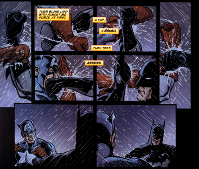 But it goes deeper than that. Ignoring for a moment how cool their “meta” fight is (they consider fighting, but decide that they’ll fight each other to a standstill, so just decide to team up instead), Busiek hits on some fairly fundamental points of comparison between the two. “You… lost a partner?” Captain America suggests as he stumbles across the memorial for Jason Todd in the Batcave – calling to mind the death of Bucky in the Second World War. When Captain America reveals an ace up his sleeve, Batman acknowledges that he too is a master strategist. “You were more prepared than you seemed,” he concedes. The collection opens with Batman telepathically coordinating a Justice League assault, and it ends with Captain America telepathically directing both the League and the Avengers. They’re quite alike, but born on different worlds.