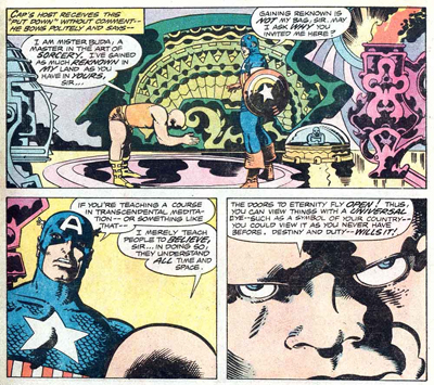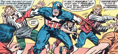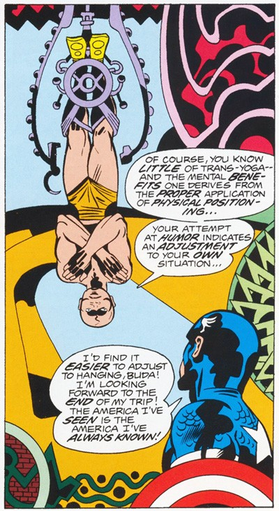 Indeed, when Steve Rogers does manage to discover the meaning of America, there are hints smilar to those Grant Morrison would extend past Kirby’s Fourth World into a hypothetical Fifth World during his Justice League of America run and his Final Crisis, the notion of humanity itself becoming home to a new future and a new mythology with boundless potential. Captain America talks to kids on a street corner about the unlimited potential of America, “It isn’t an object, exactly — it’s a terrific feeling that we can become strong and smart enough to beat the overwhelming problems which every American has to live with!!” A kid replies in a Morrisonian manner, “Sure! We can become like superheroes!”