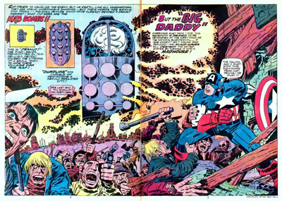 Kirby seems to focus on the scientists who develop weapons like that, casting the developer of the Mad Bomb as trapped in his own tragedy. Later on, in the Zero Street arc, we discover that “Bother Wonderful” used to be a scientist who was committed to the mental institution, Doctor Abner Doolittle, “a nuclear physicist.” Similarly, Armin Zola represents scientific advancement unbound by ethical concerns, the successor to the Josef Mengele or the Japanese Unit 731. “Youth forgets,” Captain America remarks when Zola’s plan to resurrect Hitler is revealed, “but we remember, don’t we, Zola!”