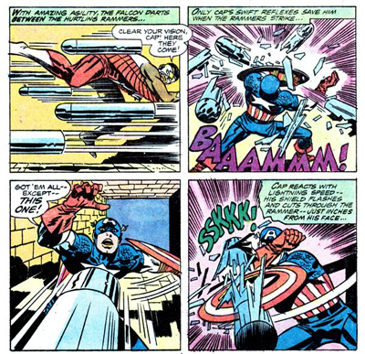 Of course, detractors would argue that it’s all plot-driven nonsense, and that there’s no real sense of depth to it. I’d disagree with the assertion that Kirby’s work is in any way shallow, but I have to concede that his dialogue and scripting might not match pace with his ideas. His Steve Rogers is exceptionally fond of phrases like “Holy Toledo!” and “Good gravy!“, just as the Falcon has a tendency to use  “Jive!” At one point, Captain America invites an opponent, “Go ahead, Taurey! You’ll never get a better chance to get your rocks off!” I never had Captain America pegged as a Rolling Stones fan.