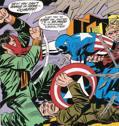 It’s also worth noting that Kirby’s Captain America run sort of skirts with continuity in a fascinating way. While Kirby helped define the shared Marvel Universe while working with Stan Lee, he cleverly steers clear of crossovers or cameos in these adventures – with a guest appearance from Magneto perhaps the closest thing to a crossover. On the other hand, he does make frequent reference to Nick Fury, and also cites characters like Reed Richards and Doctor Doom. I like this approach, and I think it works – after all, I’m reading a comic about Captain America. If I wanted something else, I could buy The Avengers.