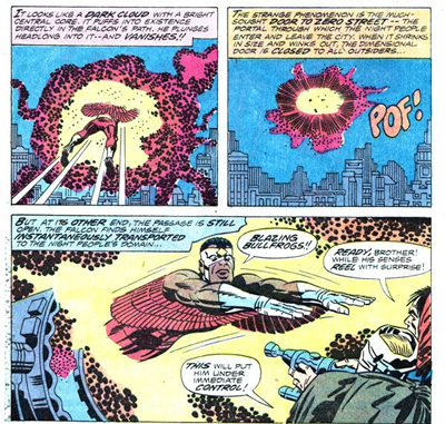 More than that, though, Kirby seems to cut his Swine plot thread a bit short, literally having a monster appear from off-panel and brutally murder the despot at the most convenient of moments, thus cutting off the story arc rather abruptly. Later on, the Falcon is investigating Captain America’s disappearance, with an issue’s penultimate page setting up a cliffhanger confrontation with a monster. It seems that Kirby forgot about this plot point (or wasn’t too interested in it), because the next time we see the Falcon is by Captain America’s bedside after everything has wrapped itself up. Steve provides some handy exposition, “I understand that S.H.I.E.L.D. team yanked you from a nasty fracas!”