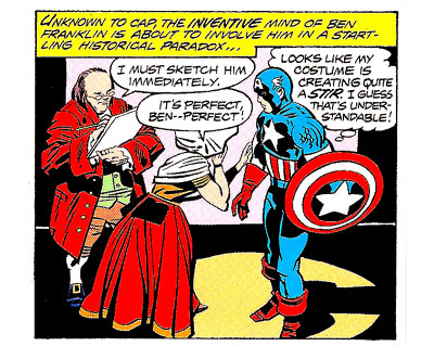 There’s something gleefully post-modern about Kirby’s work on Captain America’s Bicentennial Battles, where a time-travelling Captain America actually manages to inspire the American flag in a “startling historical paradox.” The flabbergasted hero declares, “It isn’t possible! It just isn’t possible! I-I’ve been ripped off by Benjamin Franklin!” Things get slightly weirder when Steve Rogers actually meets a young paper boy who may be Jack Kirby and perhaps even inspires his own creation.