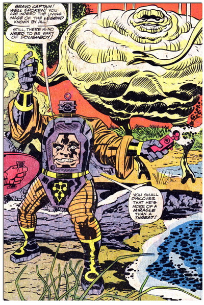 Still, that can be forgiven when Kirby’s imagination works, as it does with concepts like the sinister “love machine”, Kirby crafting a totalitarian regime based on Orwell’s 1984 that seems to prefigure Apple’s iconic television commercial, hosted by an interface that “just a composite face, put together by a computer”, introduced years ahead of Max Headroom. Similarly, there’s a reason that Kirby’s Armin Zola has become a key part of the Captain America mythology – there’s just something so wonderfully unnerving about the character and his design.