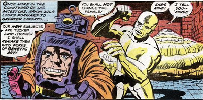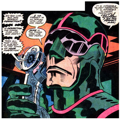However, the opposite is also true. It seems that there are times when Kirby’s attention span wanders from the plot he has set up, and so the writer and artist just casually brushes everything he isn’t interested in developing aside. The most famous story-arc collected here, for example, the Mad Bomb arc, reads almost like a collection of stand-alone stories, each with its own wacky high-concepts that are brought up and promptly forgotten. Monster men! Death derby! The love machine!