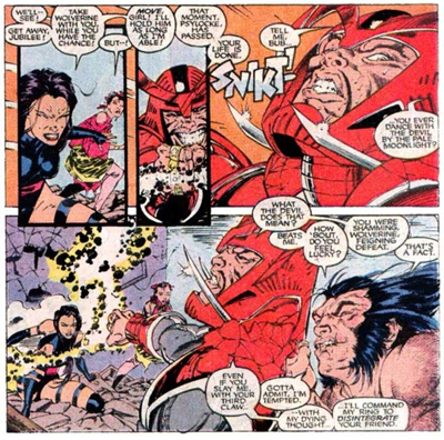 In fairness, Claremont also had quite a gift for looking to the work of fellow creators and consolidating their own clever ideas into his work as an affectionate form of homage. The Acts of Vengeance tie-in reads as an extended homage to Frank Miller, the writer and artist who collaborated with Claremont on the Wolverine miniseries. Hell, Psylocke’s ninja outfit is pretty much a direct lift of Elektra’s, only in purple instead of red. Claremont and Lee also switch the Hand’s ninjas from red to purple, to make the comparison clearer. Even outside of that, pairing Wolverine with Jubilee creates a sort of Batman-and-Robin type relationship, mirrored in Jubilee’s wardrobe, with the yellow cape, green shorts (and boots) and red top. The notion of a female Robin itself seems like a shout-out to The Dark Knight Returns.