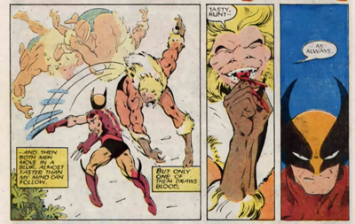 On the other hand, it’s nice to have some Nocenti Daredevil in the collection. It seems like Nocenti was particularly closs to the “X” office, with her Daredevil crossing over with Fall of the Mutants and Inferno as well. I wouldn’t mind having a nice collection of the author’s run. I’ve never read it fully, but I’ve picked up snippets – I adore the famous Acts of Vengeance crossover that she did which pitted Daredevil against Ultron. Anyway, back to the story at hand, which actually works surprisingly well as a stand-alone tale and something of an interlude in the larger crossover (while also exploring some of the aftermath of Born Again), with the Man Without Fear intercepting Sabretooth shortly after the atrocities, and allowing the author time to meditate on the difference between men and beasts.