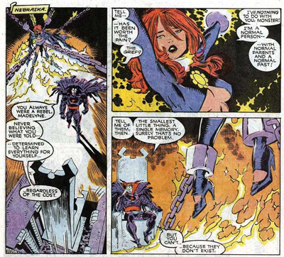 It’s a bit of shame, as Claremont uses Madelyne to explore some of his key themes. Claremont has typically written strong women, most notably Storm, perhaps the strongest female character at Marvel for the length that Claremont was writing Uncanny X-Men. Despite Claremont’s wonderful capacity to write strong feminist characters, it’s a recurring notion that such female characters can lose touch with their humanity in trying to divorce themselves from traditional female gender roles. Claremont seemed to argue that being female and being powerful were not mutually exclusive traits, and an attempt to sacrifice femininity for power would always result in tragedy. The key was to balance the two elements, rather than trying to reject one in service of the other.