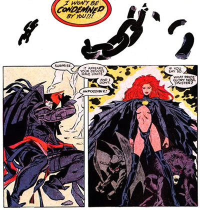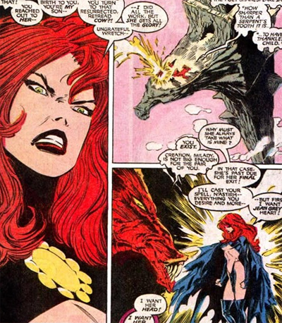 Inferno plays into those themes with Madelyne, as the demon S’ym appeals to her, “Wouldn’t you rather shape your own destiny… than play the perpetual victim?” Much like Mastermind’s attempt to dominate Jean Grey led to her transformation, Madelyne is spurred on by Sinister’s attempt to subjugate her. “I don’t belong to you, Sinister! I won’t be ruled by you!!! I won’t be condemned by you!!!” Madelyne’s transformation is presented as reactionary – fueled by the idea that it’s better to harm others than to be harmed oneself. “I won’t be condemned, Sinister— instead I condemn!”
