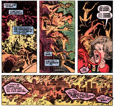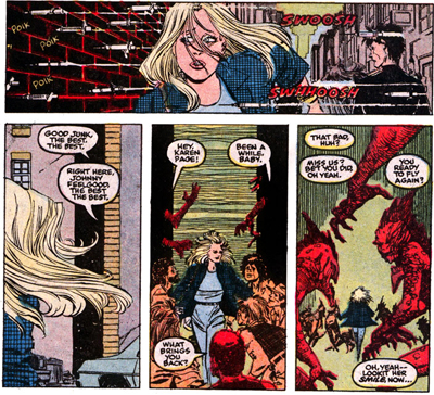 I’m generally skeptical of big events like Inferno or Acts of Vengeance because they typically derail the smaller titles sucked into their orbit. It’s a rare writer who can make that sort of event work for them, and Nocenti’s Daredevil is one such title. She never loses her characters in the midst of all this, and what the appearance of Hell on Earth must mean to people like Matt Murdock or Wilson Fisk. In one small vignette, the Kingpin contemplates the disaster. “But some small part of him, perhaps, expected a day of reckoning,” we’re told. The demons taunt him when he vainly declares his own authority and independence, “You’ve been working for us for a long time now. But you know that.”