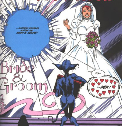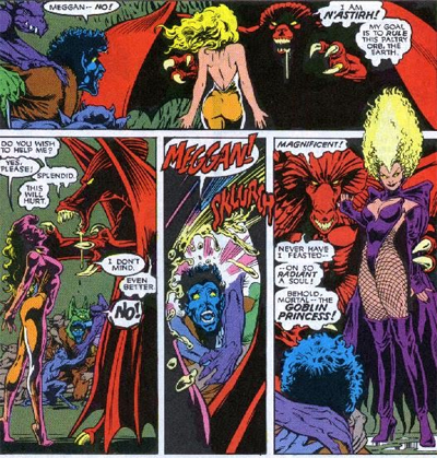 Fans of Claremont will recognise the familiar plot devices. There’s mind control and body transformation, two of Claremont’s recurring motifs. Obviously these mirror the developments in Inferno, with Meggan’s transformation into the Goblin Princess obviously echoing Madelyne’s into the Goblin Queen, and Captain Britain’s submission mirroring Havok’s similar subjugation. (By the way, I love how Inferno goes out of its way to ensure that the men are just as scantily-clad as the women – while Madelyne’s top seems to defy gravity, Brian Braddock offers a healthy side of beefcake; equal opportunity fan service!) However, we also get Kitty transformed into a literal Shadow Cat and Rachel rendered into a creepy living plastic doll.