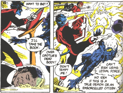 When Rachel has a freak-out, he isn’t concerned about a team-mate, but upset his rest was disturbed. “Grief!?!” he insists. “Is there no such thing around here as a normal night?!!” Viewing the damage created by Rachel, he is less than sympathetic. “What a mess!” he astutely observes. “Why couldn’t she have used the door?!” Not to mention his complete lack of any sense regarding Meggan, which Nightcrawler astutely picks up on. Claremont always had a gift for team dynamics, and I can tell from these issues that Excalibur certainly offered a compelling one.