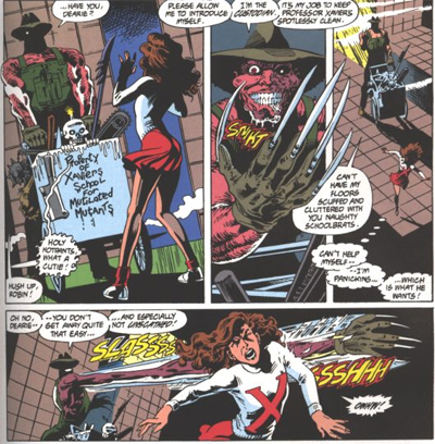 Kitty Pryde’s reaction to being cast as a cheerleader in a Nightmare on Elm Street bit is absolutely priceless (“I hate it I hate it”) and one could argue that Rachel’s role here as a human mannequin evokes the schlock of Vincent Price’s House of Wax. (Of course, given Claremont’s fondness for Doctor Who, especially in Excalibur, it could be a reference to Spearhead from Space.) I think it’s interesting that Claremont has an eye for classics – even when writing about pop culture. While his examples are obviously dated, he has a knack for latching on to images and ideas that remain in the public mind until today. We know, for example, that Brian is an obvious send-up of Freddie Krueger and Rambo, even if both franchises are nowhere near as popular as they were when the adventure was written.