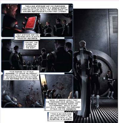 I do like the way that the pair play up the religious aspect of the X-Men’s current troubles. After all, religious fundamentalism (of all denominations) is an increasingly serious concern in the modern era. More than that, though, it fits with the “mutants-as-gays” or “mutants-as-Israel” metaphor that Matt Fraction was crafting over on Uncanny X-Men at the same time. Both groups find themselves under siege from those holding strong religious views, and its that fundamentalism, the unquestioning belief in some higher form of moral authority, that makes them such dangerous adversaries.