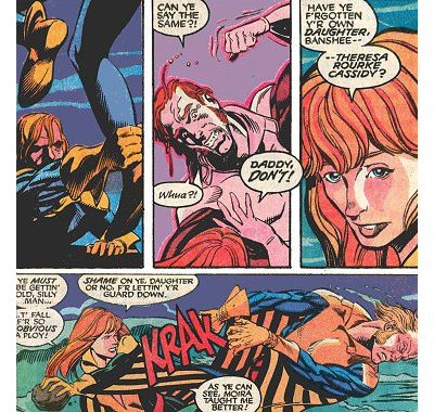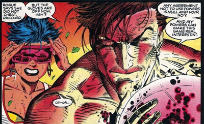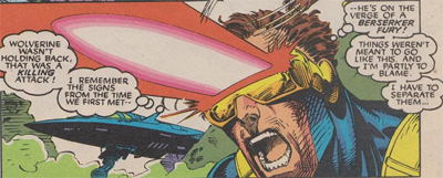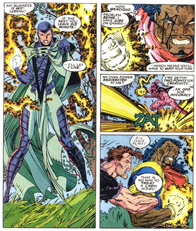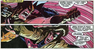 Despite that disappointing aspect of it all, there is a sense that Claremont is finding his feet again. While familiar quirks are in effect (long monologues, kinky sex stuff), there’s a sense that Claremont is a bit more relaxed and fluid than he has been in quite a while. In fact, he seems to enjoy a bit of self-criticism here, acknowledging his own flaws. It’s nothing new to see characters comment on the author’s verbosity, with Gambit ambushing Wolverine in the danger room while the latter is musing on life (“wrong time for questions, Bo”), but he seems to accept some pretty direct criticisms of his recent work.