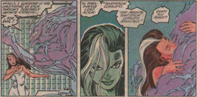 Xavier himself, the father of the X-Men (often absentee during Claremont’s tenure, describes the Shadow King, “My oldest foe, Stevie. In many respects, the primary reason… I created both this school and the X-Men.” He is, according to Professor X, “the antithesis of my dream.” It kinda works, but not really. The Shadow King never feels like that big a deal, despite years of build-up. There’s no real sense of who or what is beyond “really evil.” I get that he is the embodiment of hatred as Xavier’s philosophy embraces love, but he never feels like that much of a complex character, and certainly not important enough to anchor a plot like this.