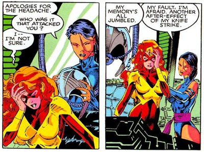 Later on, echoing uncomfortable scenes from X-Tinction Agenda, the creepy Brainchild contemplates a powerless Rogue, observing that this opens “all manner of intriguing possibilities.” This is a character, after all, who uses exclusively female slaves (“pets”) bound to his will. In X-Factor, we’re even treated to some familiar Claremontian age-play, as the sinister Psynapse attacks Jean inside her head, deaging her as Magneto did to the X-Men and as Nanny did and as happened to Storm. “You’re a real baby now, Red, in form as well as nickname.”