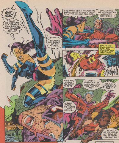 Arguably the nineties were to be a decade driven by artists-as-writers. Todd McFarlane came off a run on The Amazing Spider-Man with David Michelinie and began writing and illustrating his own adjectiveless Spider-Man. When that fell through, he left to found his own company, just as Jim Lee would leave to found his own company. I always loved the story (probably just an urban myth) that Alan Moore was asked to write “words” for the Man of Steel reboot plotted by John Byrne. Moore, apparently a bit more good-natured than he is now, supposedly replied, “Only if he inks my pencils.”Claremont had increasingly felt like a bit of a puppet, as his own characters and plots became secondary to the demands of bigger names. Indeed, one can almost see Claremont engaged in a tug-of-war over the character of Magneto in these very pages.