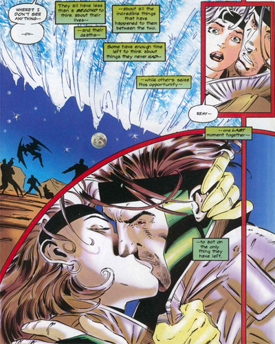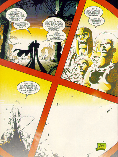 Hell, even the introductory Legion Quest issues work remarkably well, offering an “ending” to the standard X-Men universe, with our familiar characters effectively watching the lights go out in the universe. There’s something fitting about the X-Men ending up “crystalized” in time, frozen in particular moments like frames in a movie or panels in a comic book. Wolverine spends the end of time locked in battle with Sabretooth. It couldn’t have ended any other way. Professor X remarks to his X-Men, “It is a gift called ‘closure’ and allows those who live on beyond you — to face the world without rage, anger, or sorrow.”
