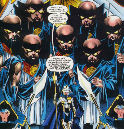 The crossover paints the villain as a would-be Hitler, a genocidal mad man obsessed with the idea of “genetic superiority.” The Kelly Pact he signed with the humans seems more than a bit like Hitler’s Munich Agreement. He herds humans to death camps in trains. His son is named “Holocaust”, and another is called “Abyss”, perhaps reflecting the warped interpretation of Nietzsche that the Nazis subscribed to. Sunspot explicitly calls Apocalypse as “fuhrer.” One of Callisto’s pirate crew remarks of the dead bodies, “Picked up some nice rings. Wish we had time to go for their fillings.”It recalls stories about the concentration camps.