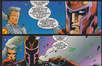 “And you would sacrifice this world completely?” Kurt asks Magneto. “Even if it means giving up our lives and that of those we love?” In a way, I think that essential emotional component gives the story a sense of weight and pathos and even tragedy that very few X-Men stories have. Charles Xavier and his mutants fight to build a better world for their children. Magneto fights for a better world his son will never get a chance to see.