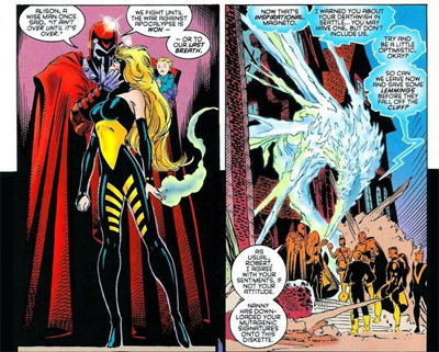 In the alternate universe created by the death of Charles Xavier, Magneto leads the X-Men. There’s a wonderful irony in the idea that their greatest foe could be their leader, but it’s also a plot point borrowed from Claremont. Claremont had skilfully developed Magneto by casting him as the replacement for Professor X around the time of the Mutant Massacre. There, as here, it was implied that Magneto was simply not a man cut out for the responsibilities and obligations of the role – he would try, but he seemed incapable of succeeding. In fact, the plot even borrows from Claremont’s later years, offering us a relationship between Magneto and Rogue, a coupling teased during one of Claremont’s last few issues set in the Savage Land.