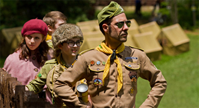 Anderson’s hyper-active imagination is perfectly suited to the film’s childish themes. There’s an air of the absurd about the picture, as if it were the world imagined through the limitless potential of childhood. Whether it’s the impossibly balanced tree house that forms the Khaki Scout headquarters or the running jump of a man carrying a fully-grown colleague on his back, there’s a sense that the laws of physics in Anderson’s universe are entirely malleable. This is, after all, a world where a building doesn’t just catch fire, it erupts in a display similar to fireworks, where Khaki Scout activities include riding a motorbike, and where an impromptu camp comes with all the modern amenities, including a support constructed specifically for the tent.