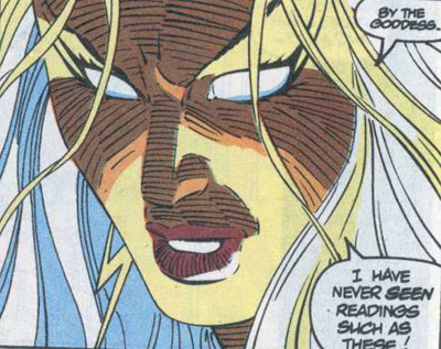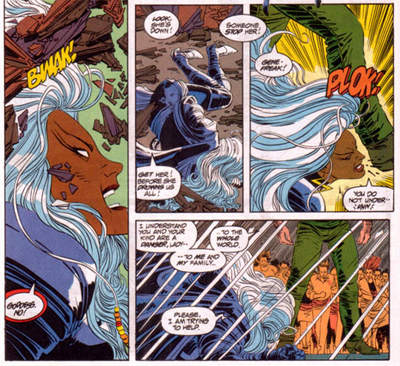 He’s found of repeating exposition, as we’re repeatedly offered some variation on the same formula when he introduces Storm, “There are many reasons why Storm is the leader of the X-Men’s Gold Team. Not the least of which is her mutant ability to control the elements.” Like Claremont, he’s fond of repeating generic catchphrases, even if Storm’s “by the bright lady!” is nowhere near as catchy as “I’m the best there is..” While Claremont adored melodramatic inner monologues, it’s still painful to hear Storm’s internal voice refer to herself in the third person as “Wind Rider.”