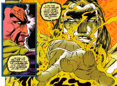 Nicieza and Lobdell don’t ignore Magneto’s origin or back story, but that arguably makes it worse. Rather than simply ignoring the contradictions in their portrayal, they actively point them out. Indeed,Fatal Attractions – curiously enough – actually seems to wallow in Magneto’s Jewish heritage. It’s strange, because that aspect of the character is seldom explored outside his holocaust back story. It’s clear that Magneto is in supervillain mode, but not any modest superhero mode. He very clearly pictures himself as Yahweh, the Old Testament God.