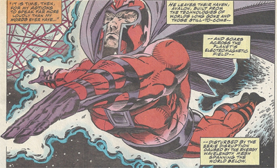 This new Magneto revels in the clichés of villainy. At one point, he punishes one of his followers, Senyaka. Senyaka had participated in a massacre a a human hospice; but Magneto does not kill his subject for that crime, he disciplines Senyaka for acting without permission. Magneto tells his son, “What you witnessed was the tossing of the gauntlet — the first sign of mutants taking the initiative to free themselves from humanity’s oppression at last.” They killed harmless sick people in their beds, the old and the weak.
