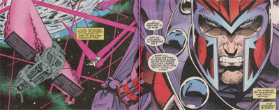 More than that, though, Lobdell and Nicieza attempt to retroactively erase Claremont’s characterisation, by suggesting that Magneto never actually changed. As Xavier observes when Magneto’s new abode comes into view, “It’s not a haven… it’s a fortress! Laden down with Shi’ar weaponry he could only have appropriated during his time with the X-Men.” It implies that Magneto was always planning something like this and never genuinely embraced Xavier’s message. Magneto even mocks Charles’ notions that he could change. “Instead,” Erik warns his old friend, “I stand before you as I have always been…”
